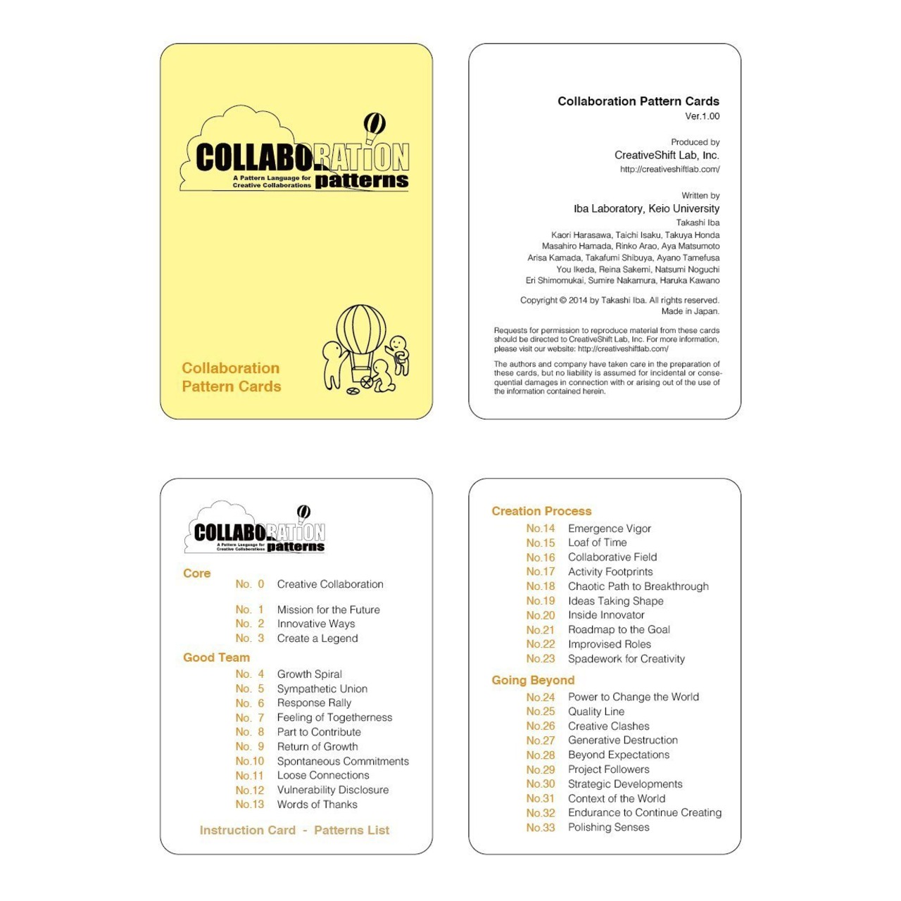 ・パターン内容は書籍『Collaboration Patterns: A Pattern Language for Creative Collaborations』(Takashi Iba with Iba Laboratory, CreativeShift Lab, 2014)に準拠